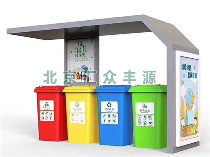 北京匯眾豐源垃圾分類亭,分為地基基礎(chǔ)設(shè)施、公益宣傳欄、立柱、頂棚等,亭內(nèi)設(shè)置可回收、有害垃圾、廚房垃圾和其他垃圾等垃圾桶宣傳欄。